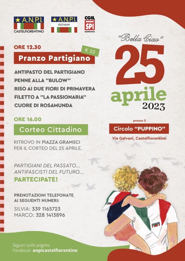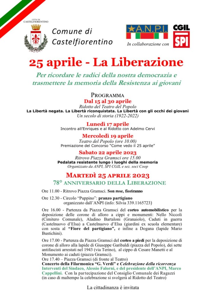 Martedì 25 celebrazioni a partire dal mattino, con la deposizione di rose presso i luoghi del martirio delle partigiane o sotto le targhe che le ricordano; a seguire il “Pranzo partigiano” presso il Circolo Puppino e corteo automobilistico e a piedi per la deposizione delle corone di alloro presso i monumeti ed i cippi a ricordo dei caduti. A conclusione della giornata un’esibizione della Filarmonica “G. Verdi” ed interventi a cura del Primo Cittadino e del presidente di Anpi.