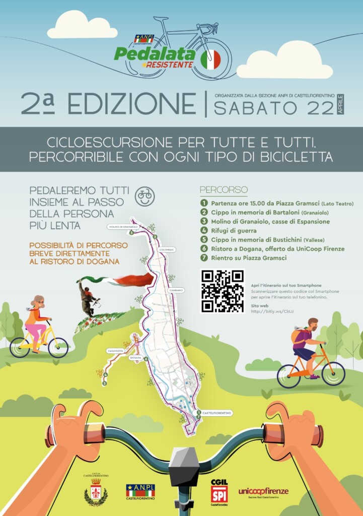 Sabato 22 aprile la seconda edizione della “Pedalata resistente lungo i luoghi della memoria” che, al passo della persona più lenta, condurrà i partecipanti presso i luoghi simbolo della resistenza partigiana a Castelfiorentino, lungo un percorso ad anello tra Piazza Gramsci, Granaiolo, Vallese, Dogana e rientro a Castelfiorentino.