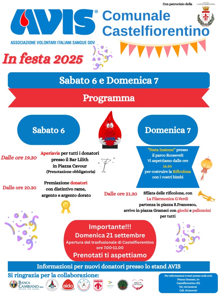 Premiare le persone che hanno fatto una scelta semplice e nobile, come la donazione del proprio sangue o del plasma a chi ne bisogno. Ma anche offrire un’occasione per stare insieme, facendo rivivere ai propri figli e nipoti una tradizione che affonda le sue radici nelle masse rurali fiorentine. E’ questo il biglietto da visita di “Avis in Festa” che sabato 6 e domenica 7 settembre torna a Castelfiorentino per un fine settimana all’insegna dell’associazionismo e della solidarietà.