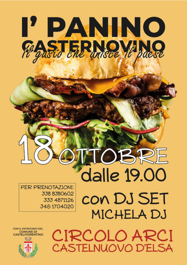Se volete provarne qualcuno non vi resta venire a Castelnuovo d’Elsa, dove sabato 18 ottobre (dalle 19.00) il borgo collinare ospita l’evento “I’ Panino Casternovino”, festa organizzata dai ragazzi del nuovo Consiglio Arci di Castelnuovo d’Elsa, durante la quale i partecipanti potranno assaporare un’ampia varietà di panini preparati con ingredienti tipici del territorio.