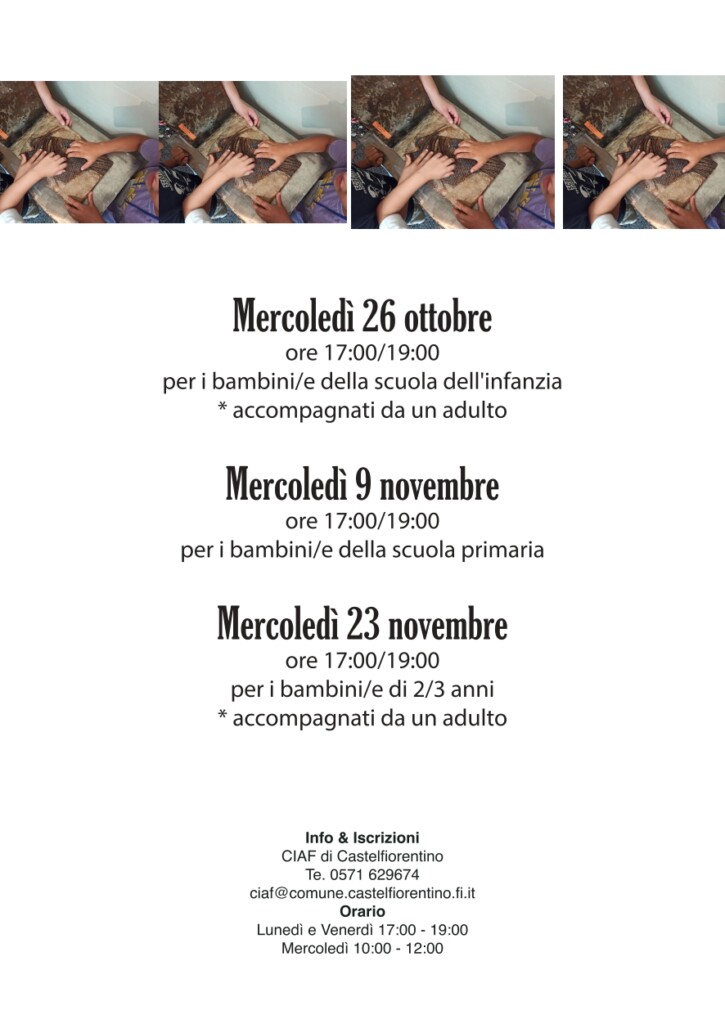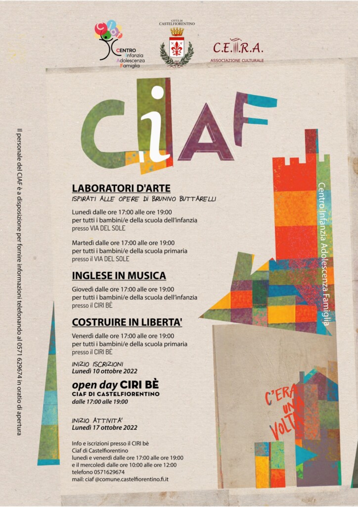 Da lunedì 17 ottobre, infine, il Ciaf organizza alcune attività che spaziano dai laboratori artistici (lunedì e martedì presso Via del Sole, rivolti rispettivamente ai bambini della scuola dell’infanzia e primaria), ai corsi di ’”inglese in musica” (giovedì presso il Ciri Bè, rivolto ai bambini della scuola dell’infanzia) ai laboratori per “costruire in libertà” (venerdì presso il Ciri Bè, rivolto ai bambini della scuola primaria). Queste attività si svolgono in orario 17.00-19.00
