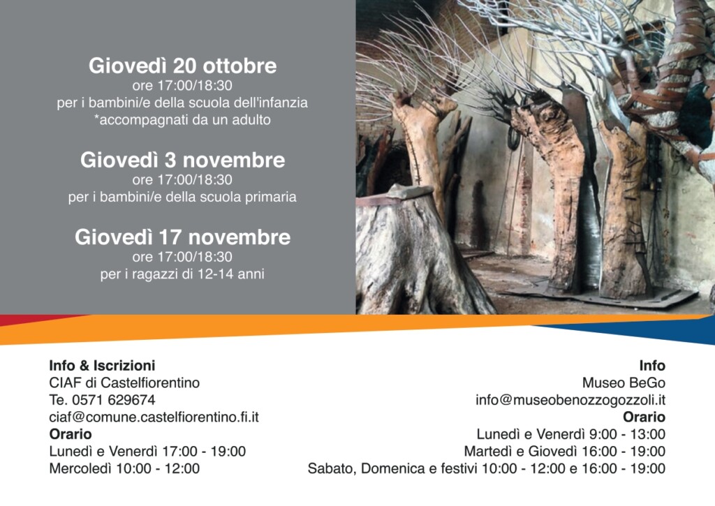 A partire dalla prossima settimana, il progetto “Metamorfosi” proseguirà presso il Museo Be.Go attraversi alcuni laboratori d’arte ispirati all’installazione di Brunivo Buttarelli “Alberi a nuova vita” (che si trovano proprio all’ingresso del Museo). Giovedì 20 ottobre tali attività sono dedicate ai bambini della scuola dell’infanzia, accompagnati da un adulto, giovedì 3 novembre ai bambini della scuola primaria e giovedì 17 novembre ai ragazzi dai 12-14 anni. I laboratori al Museo si svolgono in orario 17.00-18.30.