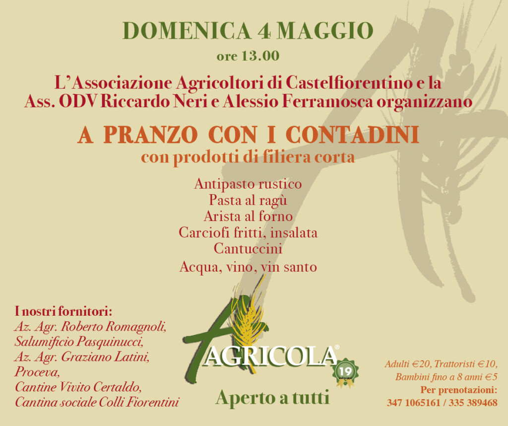 Agricola’ is promoted by the “Associazione Agricoltori Castelfiorentino – Tradizione e Sviluppo” (Castelfiorentino Farmers’ Association – Tradition and Development) with the patronage and contribution of the Municipality of Castelfiorentino, the patronage of the Region of Tuscany and the Unione dei Comuni Circondario Empolese Valdelsa, in collaboration with the trade associations CIA and Coldiretti, and the organisation of Exponent. For information: tourist office +39 0571.629049; www.comune.castelfiorentino.fi.it.