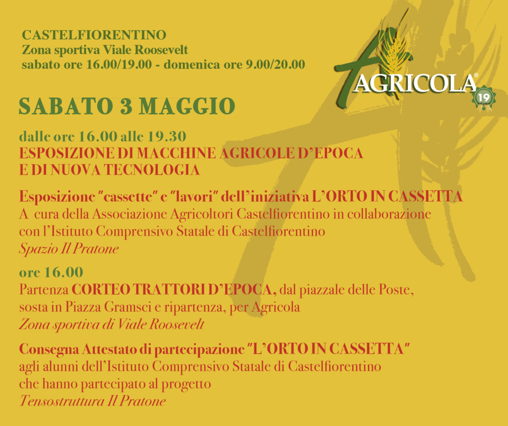 ‘Agricola,’ emphasises the mayor, Francesca Giannì, “is a precious showcase for all the food and wine excellence of our area, but it is also an opportunity to present and introduce to the citizens the “Orto in cassetta” educational project, promoted by the Farmers’ Association in collaboration with the Comprehensive Institute, and to offer a broad and diversified programme of initiatives capable of addressing a wide audience, to spend a weekend in the open air. My thanks therefore go to all those who, in various ways, collaborated again this year in the organisation of the festival’.