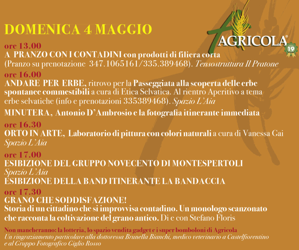 In the afternoon (from 4 p.m.) there will be an opportunity to “go for herbs”, a walk to discover wild edible herbs organised by Etica Selvatica; on the way back, an aperitif on the theme of wild herbs with Cinzia La Vivandiera, an expert in natural cooking (info and reservations as for lunch). There will also be Antonio D’Ambrosio with his photography set on minutera (instant development), a natural painting workshop organised by Vanessa Gai, and workshops for adults and children in “Gli antichi mestieri” (ancient crafts) to learn how to make a basket, stuff a chair or a flask, and work with wood. There will also be a performance by the Gruppo Novecento of Montespertoli and a travelling performance by the ‘Bandaccia’, while at 5.30 p.m., not to be missed is the story of a citizen who improvises himself as a farmer: ‘Grano che soddisfazione’ (Wheat that satisfies) is the title of this light-hearted monologue that tells the story of the cultivation of ancient grain (by and with Stefano Floris)