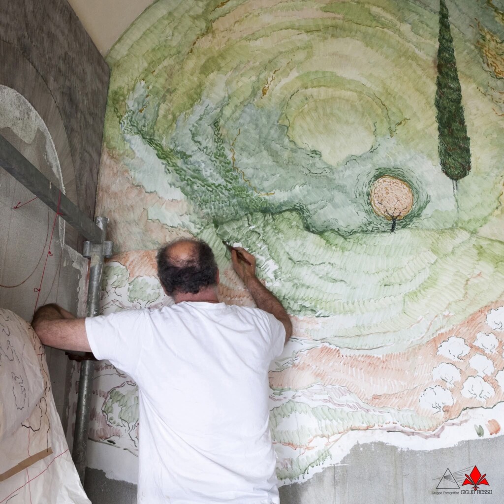 The catalan artist, a specialist in frescoing large architectural spaces and capable of executing fantastic pictorial cycles in many parts of the world, has in fact created a new work inside the Chapel (located in the street that not by chance bears the name of the famous florentine painter), again based on the fresco technique, which will be open to the public in its entirety starting Wednesday 18 June, thanks to the availability of the ‘Sveliamo La Marca’ Association.