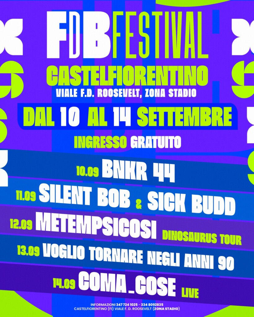 And that’s not all. In addition to the big-name artists already confirmed, the Festival will also feature emerging bands and local DJs, who will liven up the opening and closing nights, offering the audience an even richer and more engaging experience. On Sunday 14 September, for example, the evening will be opened by “Incubo!”, a young and promising band from Empoli that is gaining increasing popularity. But there will be more than just music: the FDB Festival will also feature many side events that will enrich the programme, with car tuning rallies, the famous Panda rally, as well as presentations by Castelfiorentino’s sports teams and many other activities designed to engage and entertain audiences of all ages.