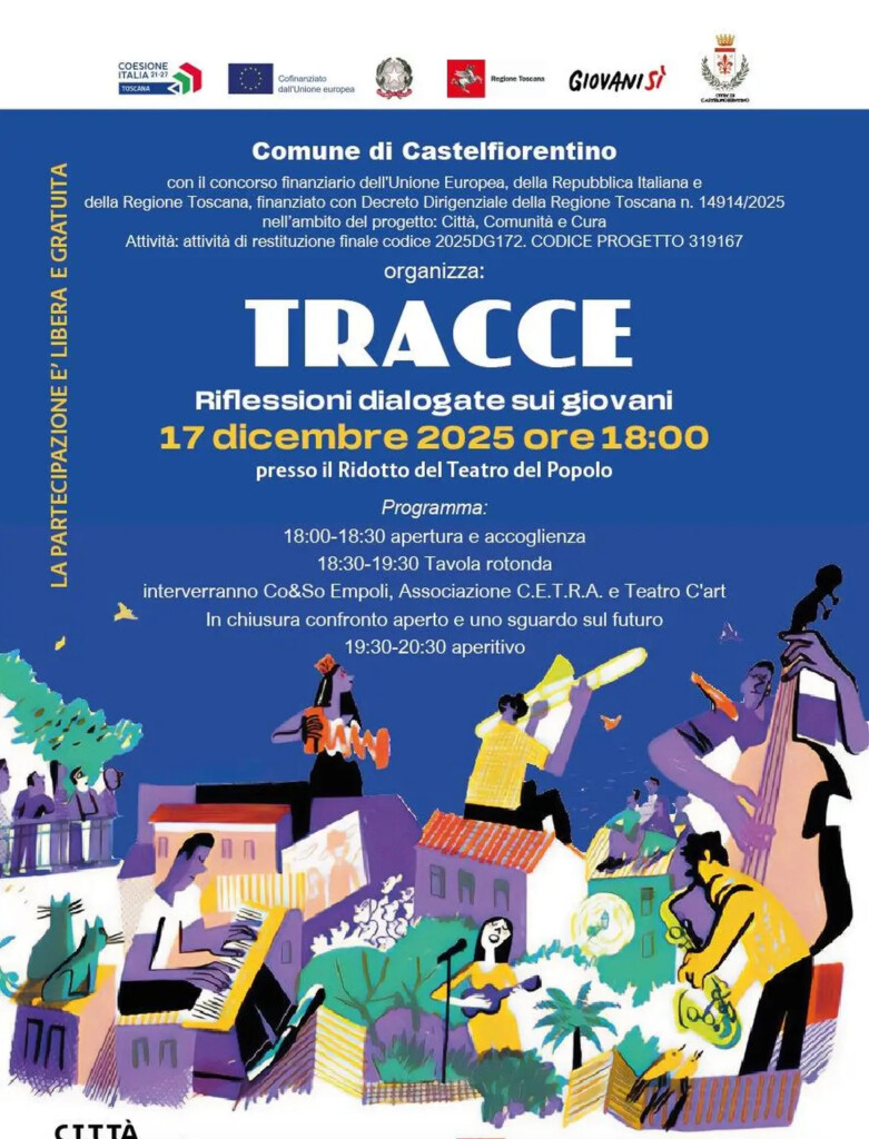 An evening dedicated to young people, but open to all citizens of Castelfiorentino. A comprehensive reflection on young people, with particular regard to the issues of social protection and active participation in community life. This is the theme of the initiative “Tracce. Reflections on young people in dialogue”, which will take place on Wednesday 17 December (6:00 p.m.) at the Ridotto del Teatro del Popolo, at the conclusion of the “City, community and care” project, co-funded by the Tuscany Region.