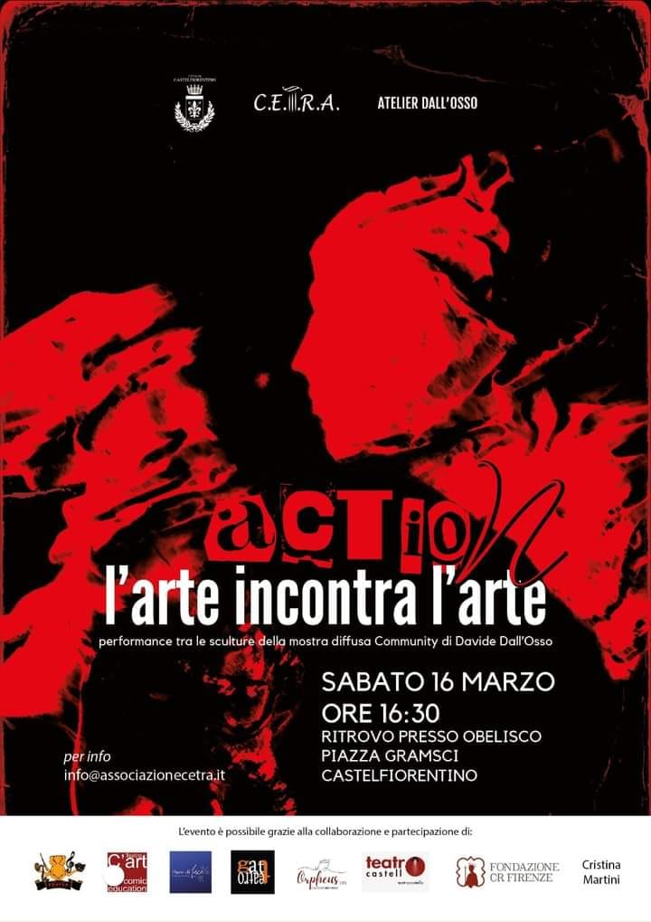 Sei spettacoli all’aperto tra le sculture di Davide Dall’Osso. Un pomeriggio di Teatro, musica e poesia. E’ questo il corposo programma della performance “Action: l’arte incontra l’arte” che attraverso cinque sei postazioni andrà in scena sabato pomeriggio (16 marzo) nel centro urbano di Castelfiorentino, con ritrovo alle 16.30 in Piazza Gramsci.