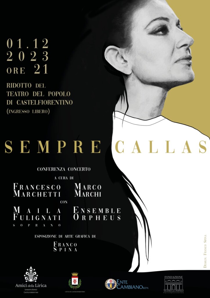 La serata, che contempla l’esecuzione dal vivo di alcuni brani tratti da alcune tra le più significative opere liriche del repertorio della Callas, sarà alternata da un colloquio tenuto da Francesco Marchetti (tenore e vicepresidente dell’Associazione Amici della Lirica), e dal Prof. Marco Marchi (Docente di Letteratura italiana moderna e contemporanea presso la Facoltà di Lettere e Filosofia dell’Università degli Studi di Firenze) che toccherà vari aspetti della rivoluzionaria figura del soprano greco.