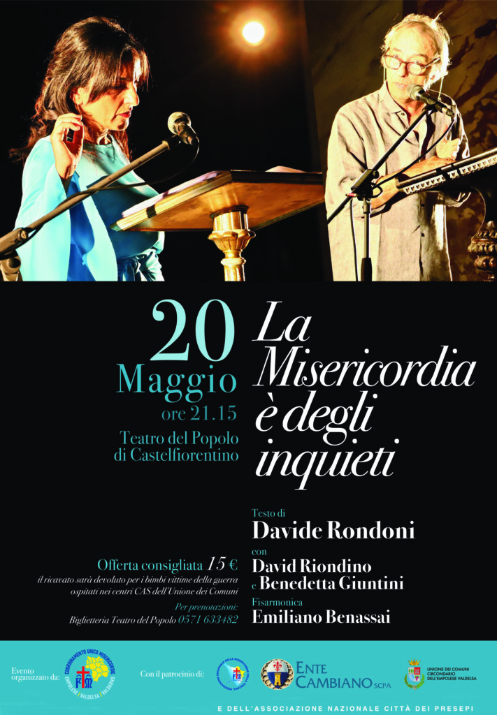 La serata, organizzata dal Coordinamento delle Misericordie Empolese Valdelsa Valdarno, patrocinato dall’Unione dei Comuni Empolese Valdelsa, dalla Federazione regionale delle Misericordie della Toscana, dall’Associazione Nazionale Città dei Presepi e dall’Ente Cambiano Spca, vedrà sul palco David Riondino, cantautore e scrittore, che interpreterà l’inquietudine, la trasposizione di un sentimento che appartiene al mondo contemporaneo, insieme all’attrice Benedetta Giuntini nei panni della Misericordia (fisarmonica Emiliano Benassai).