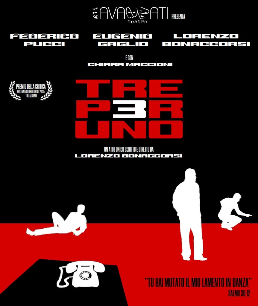 Interpretato da Federico Pucci, Eugenio Gaglio, Chiara Maccioni, Lorenzo Bonaccorsi (che ha curato anche la regia, oltre ad essere autore di questo atto unico), lo spettacolo “Tre per uno” ha ricevuto anche un Premio della Critica al 7° Festival degli Atti unici, Premio Antonio Orchi 2025 (Tolfa, Roma).