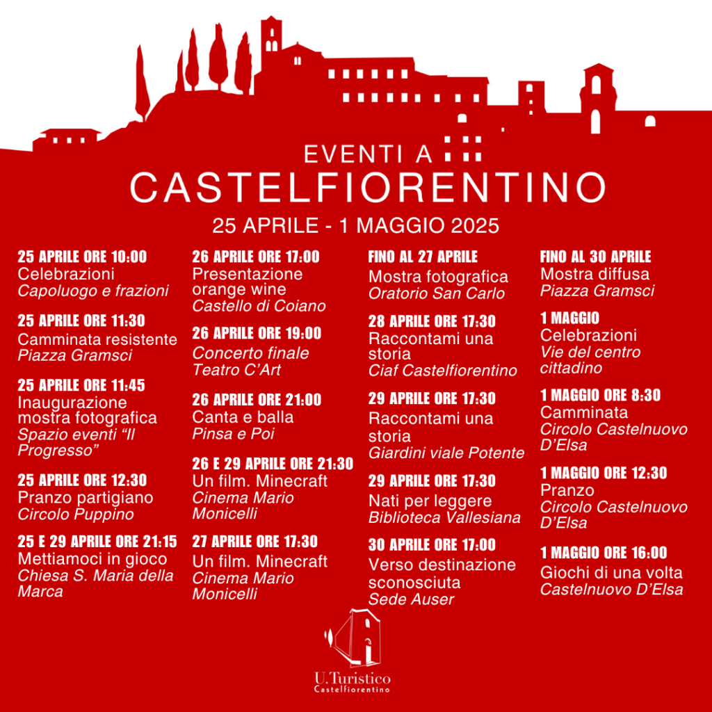 Aprile 24, 2025 Stefania Sussi 209visualizzazioni Da venerdì 25 Aprile a giovedì 1 Maggio Categories: Eventi Tags: Castelfiorentino, cosa fare, eventi, idee