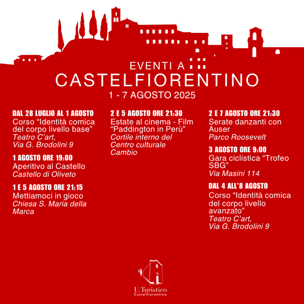 Luglio 31, 2025 Stefania Sussi 195visualizzazioni Da Venerdì 1 a Giovedì 7 Agosto Categories: Eventi Tags: Castelfiorentino, cosa fare, eventi, idee
