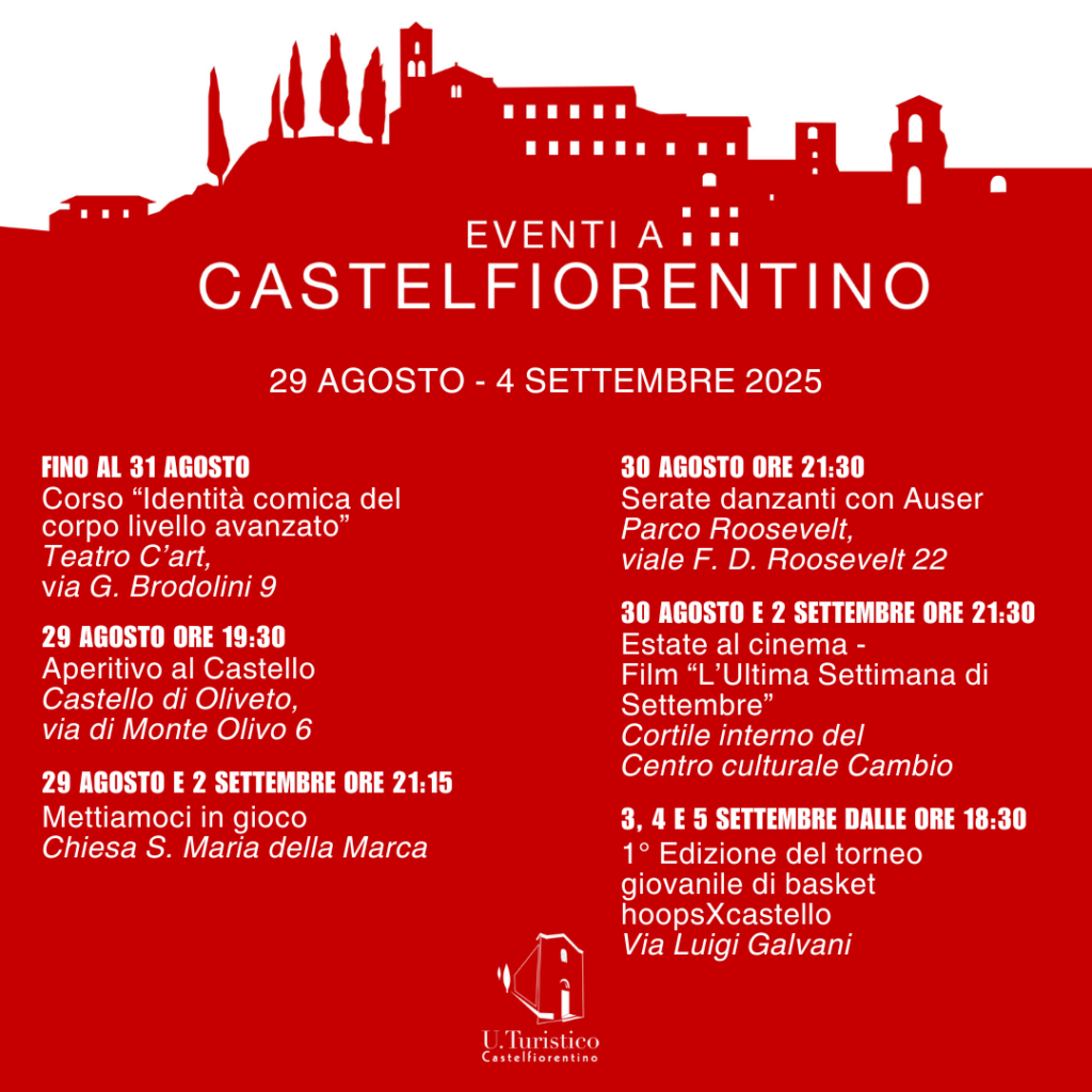 Agosto 28, 2025 UfficioTurismo 113visualizzazioni Da Venerdì 29 Agosto a Giovedì 4 Settembre Categories: Eventi, Eventi, News Tags: Castelfiorentino, cosa fare, eventi, idee