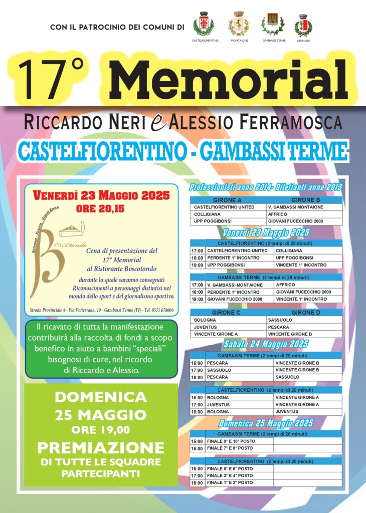 Da venerdì a domenica è in programma il torneo negli stadi di Gambassi Terme e di Castelfiorentino, quest’ultimo intitolato nel 2016 proprio a Riccardo Neri, che fin da sei anni aveva iniziato a giocare a calcio nelle giovanili del Castelfiorentino.