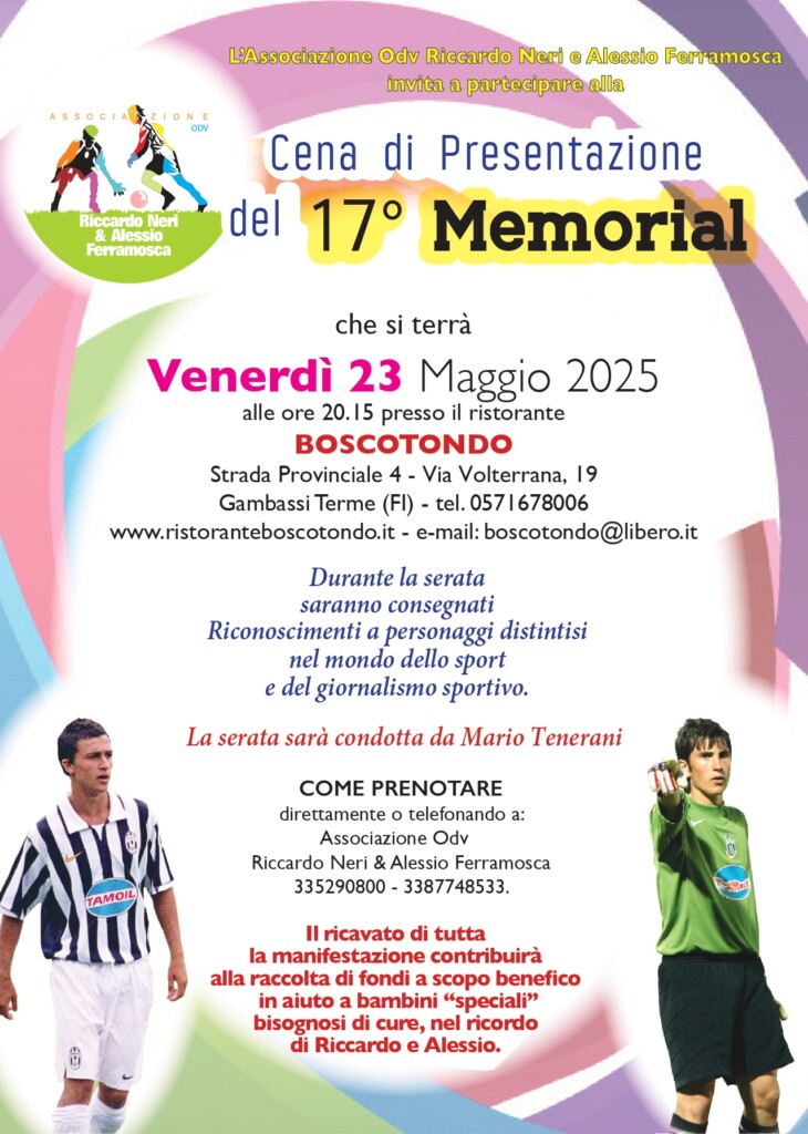 Giunto alla 17° edizione, il Memorial sarà presentato nel corso di una cena in programma venerdì sera (23 maggio, ore 20.15) presso il ristorante “Boscotondo” di Gambassi Terme (prenotazioni: direttamente al ristorante oppure 0571.629112, 335.290800, 338.7748533); durante la serata, condotta dal giornalista Mario Tenerani, saranno anche consegnati riconoscimenti a personaggi che si sono distinti nel mondo dello sport e del giornalismo sportivo.